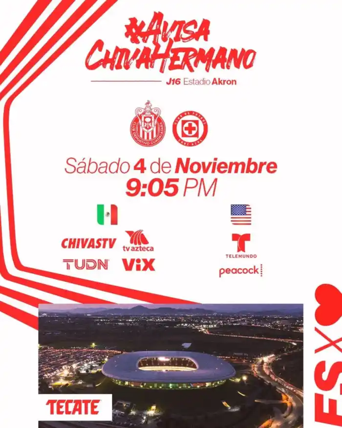 El encuentro está programado para este sábado 4 de noviembre a las 21:05 horas en el Estadio AKRON, y podrá ser visto en televisión abierta, restringida y en streaming.