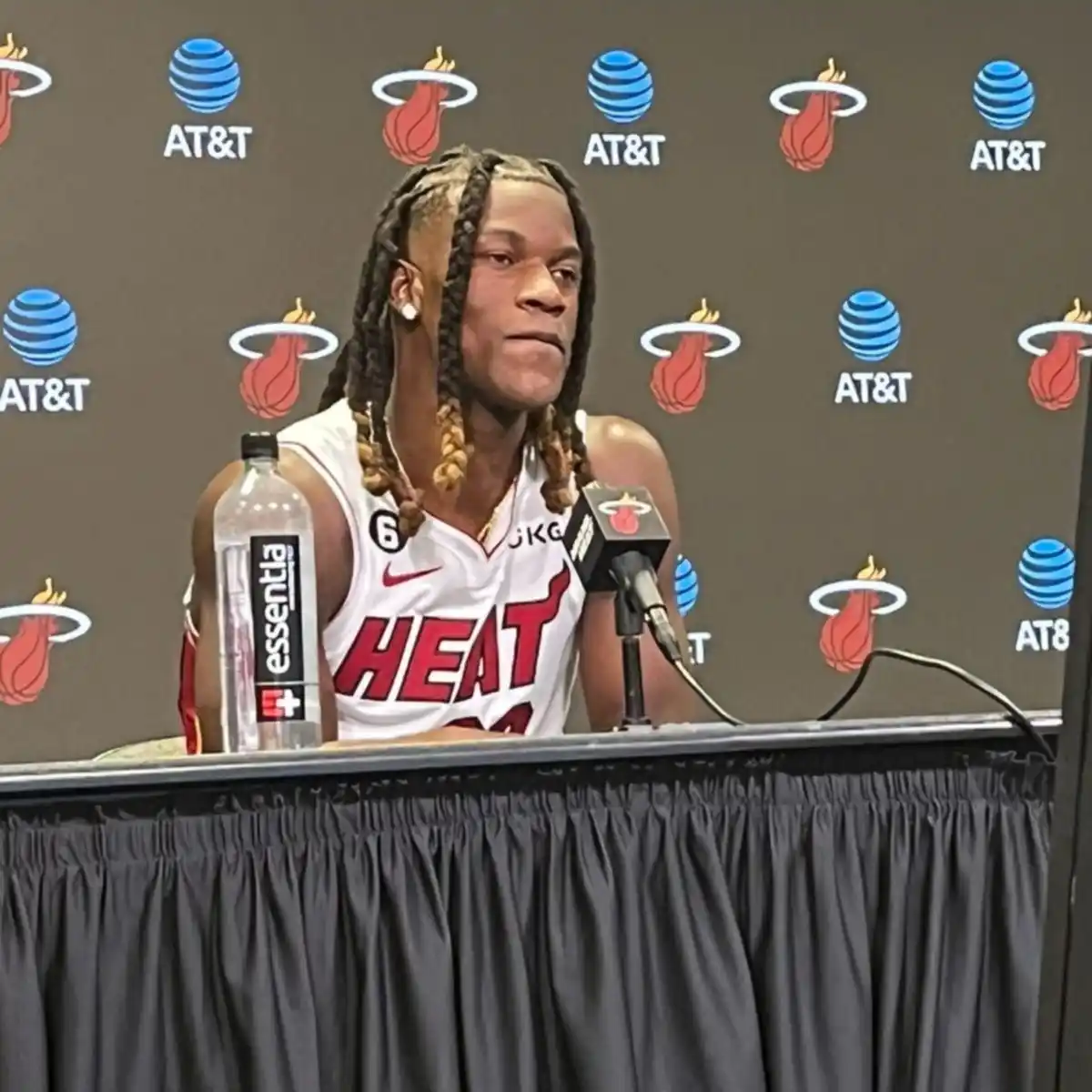 Jimmy Butler y su peinado, en el Media Day (Vía: @NBALatam en X).