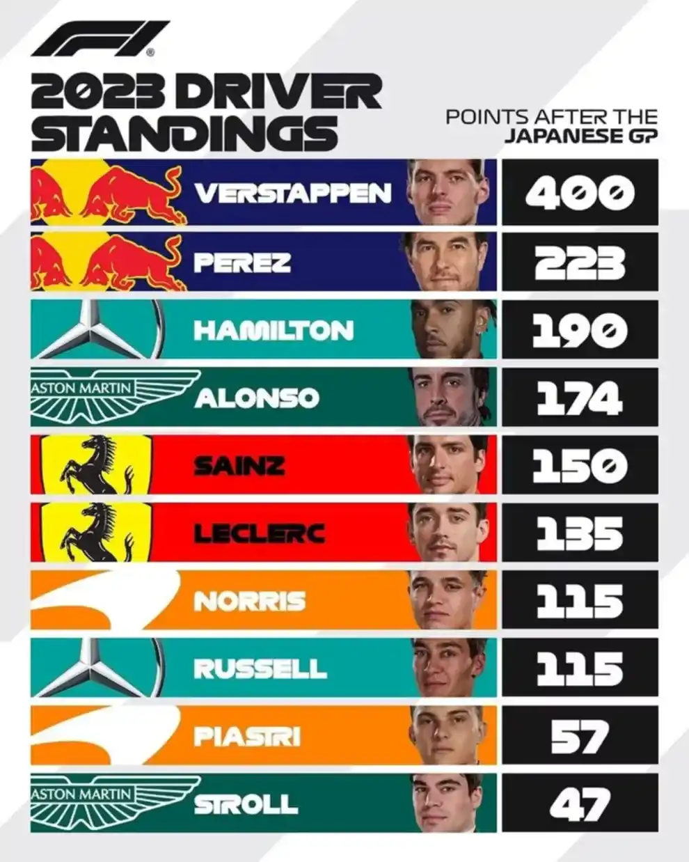 Dos poles consecutivas, su primer podio y una gran victoria en Singapur dieron la fuerza necesaria a Carlos Sainz. El madrileño ya lleva 6 carreras terminando por delante del asturiano. La previsión parece ser que Ferrari viene en alza y Aston Martin cada vez se hunde más. Alonso se encuentra 4to con 174 puntos y Sainz 5to con 150 puntos.