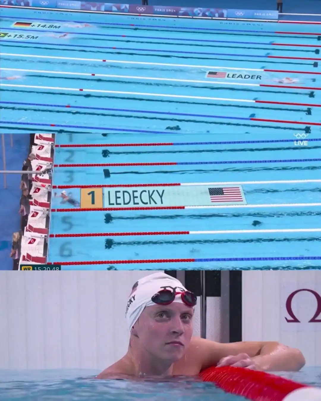 Ledecky ganó la clasificación a las finales en los 1.500 metros libres, disciplina en la que es más dominante que en los 400. Fue la mejor de su serie y también de todas las participantes, con un tiempo de 15:47.43; le sacó más de 17 segundos a su escolta, la china Bingjie Li, que tuvo el sexto mejor tiempo en total. Ledecky no estuvo cerca del récord olímpico que ella misma fijó en 2021 (15:35.35), pero aún así le alcanzó para clasificar primera a las finales de mañana a las 21.13 de París.