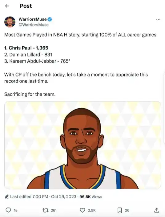 La suplencia en el encuentro del domingo pasado fue la primera para un Chris Paul de 38 años que había acumulado, hasta entonces 1.365 partidos siendo titular consecutivamente. Desde su debut en la temporada 2005-06, con la camiseta de New Orleans Pelicans, y tras su paso por equipos como Los Ángeles Clippers, Houston Rockets, Oklahoma City Thunder, Phoenix Suns y, ahora, Golden State Warriors, Paul jamás había comenzado un partido desde el banquillo.
