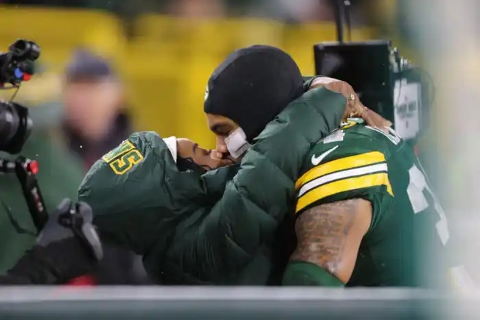 La cantante y la gimnasta presenciaron el encuentro de NFL que enfrentó a sus respectivas parejas, en Lambeau Field.