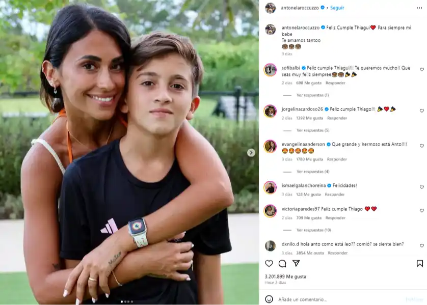 Desde su cuenta de Instagram, Antonela Roccuzzo compartió un mensaje lleno de amor para celebrar el cumpleaños número 11 de Thiago, su primogénito con Lionel Messi. “Para siempre mi bebé. Te amamos tanto”, escribió la madre orgullosa, acompañando el mensaje con una serie de fotos que muestran cuánto ha crecido su hijo. La publicación rápidamente se volvió viral, llenándose de mensajes de felicitación de seguidores y amigos de la familia Messi.