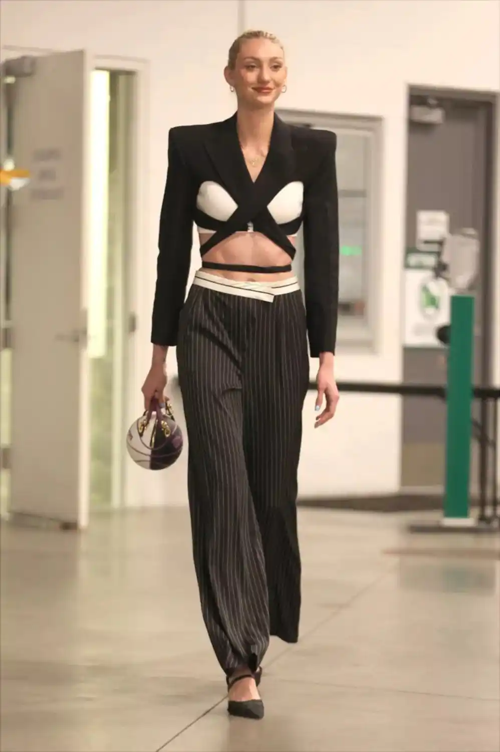 El atuendo de la novata de Los Angeles Sparks en la WNBA incluía un escote pronunciado, un cuello espectacular y medias negras hasta los muslos adornadas con encaje. Completó el conjunto con tacones altos negros a juego y guantes transparentes. También llevaba el pelo rubio peinado hacia atrás para darle más dramatismo.