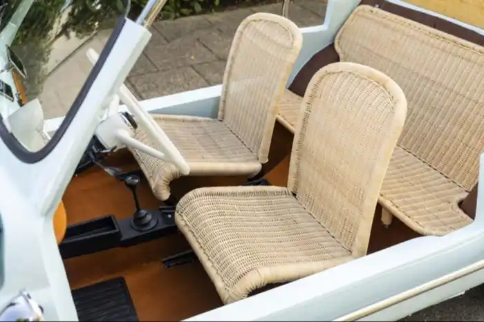 A la perfección porque cuenta con los típicos asientos de mimbre que está versión traía, no cuenta con puertas, la estructura cromada sobre los ocupantes que podría alojar un toldo o el tono de la pintura, un azul claro gellato coherente con el periodo histórico del coche.