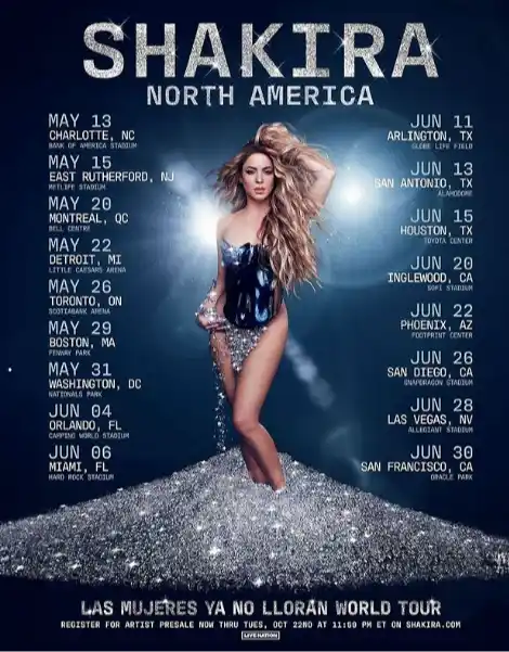 Shakira ha anunciado la ampliación de su gira mundial, "Las Mujeres Ya No Lloran World Tour", tras el éxito rotundo en la venta de entradas en Latinoamérica. La cantante colombiana decidió añadir nuevas fechas en Estados Unidos para 2025, luego de haber agotado 18 estadios en menos de dos horas en su primera etapa. El tour comenzará el 13 de mayo en Charlotte, Carolina del Norte, y finalizará el 30 de junio en San Francisco, California, prometiendo una experiencia inolvidable para sus seguidores.