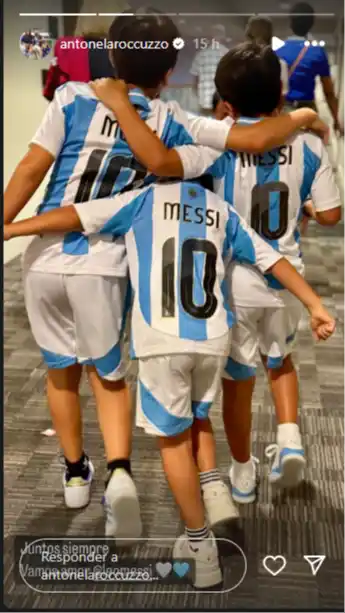 Minutos después del pitido final, Antonela Roccuzzo, esposa de Messi, compartió en sus redes sociales un emotivo momento familiar. Publicó una fotografía de sus hijos Thiago, Mateo y Ciro celebrando la victoria con las camisetas de Argentina y el número 10 de su padre. La imagen capturó el espíritu de unidad y apoyo dentro de la familia Messi, reflejando la emoción y la alegría por alcanzar otra final en la Copa América.