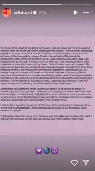 Bella Hadid se pronuncia tras su retiro de una campaña de Adidas vinculada a una tragedia histórica.