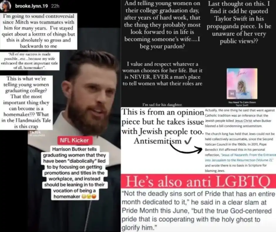 Las repercusiones alrededor de su discurso continúan. Harrison Butker, pateador de los Kansas City Chiefs, tres veces campeón de la NFL y católico practicante, dio en el Benedictine College de Kansas un discurso para los graduados en donde esbozó algunas frases polémicas y en redes sociales hubo quienes lo tildaron de misógino, homofóbico y machista. Una de las frases que más resonó involucró a su esposa y a las mujeres.