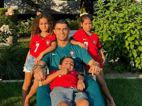 Cristiano usó su cuenta de Instagram para ofrecer un vistazo de su vida fuera del campo de juego. Publicó una hermosa fotografía donde aparece descansando en un exuberante jardín, rodeado de tres de sus hijos: Mateo, Alana Martina y Eva. Todos vestían prendas de la selección portuguesa, con los niños en camisetas rojas y Cristiano en un conjunto verde, evidenciando su orgullo y amor por Portugal.