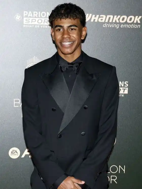 El chico de 17 años del Barça fue elegido el mejor jugador joven del mundo luego de un gran año y una brillante Eurocopa en la que fue campeón. Apostó por un look sobrio de esmoquin negro con detalles bordados en las solapas y cierre cruzado en la americana que acompañó con una camisa negra.