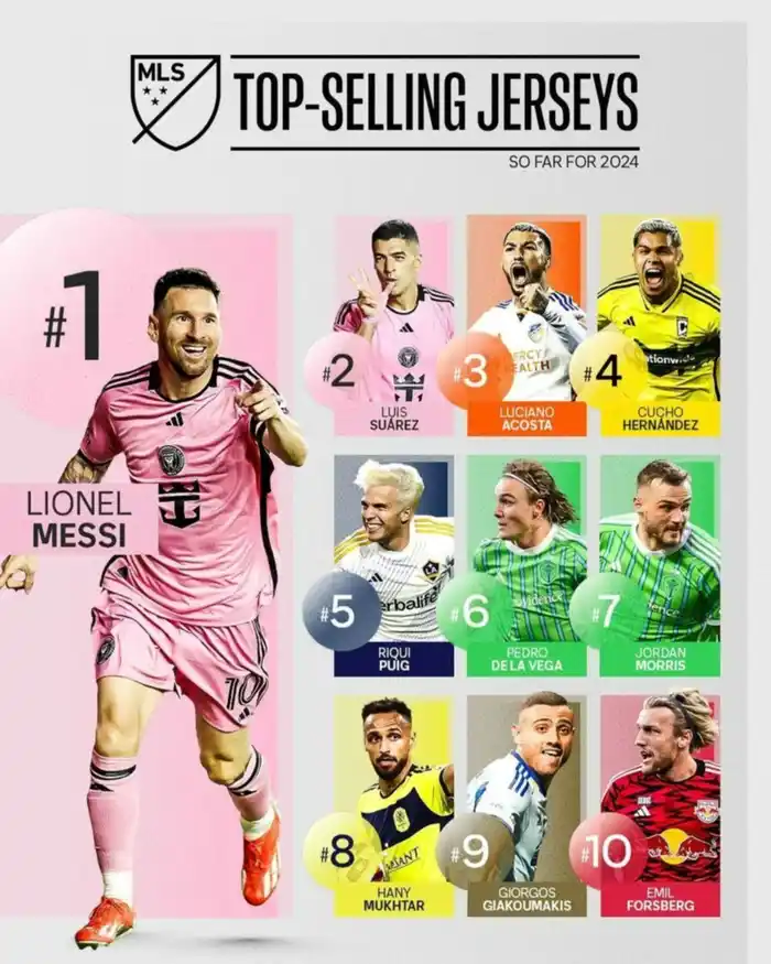 La camiseta del actual ganador del Balón de Oro y capitán de la selección argentina, Lionel Messi, sigue siendo la más vendida en Estados Unidos. Detrás del astro argentino aparece su compañero de Inter Miami, el uruguayo Luis Suárez, y en la tercera plaza, el argentino Acosta, que hace algunas semanas recibió el premio Landon Donovan al jugador más valioso de la competencia.