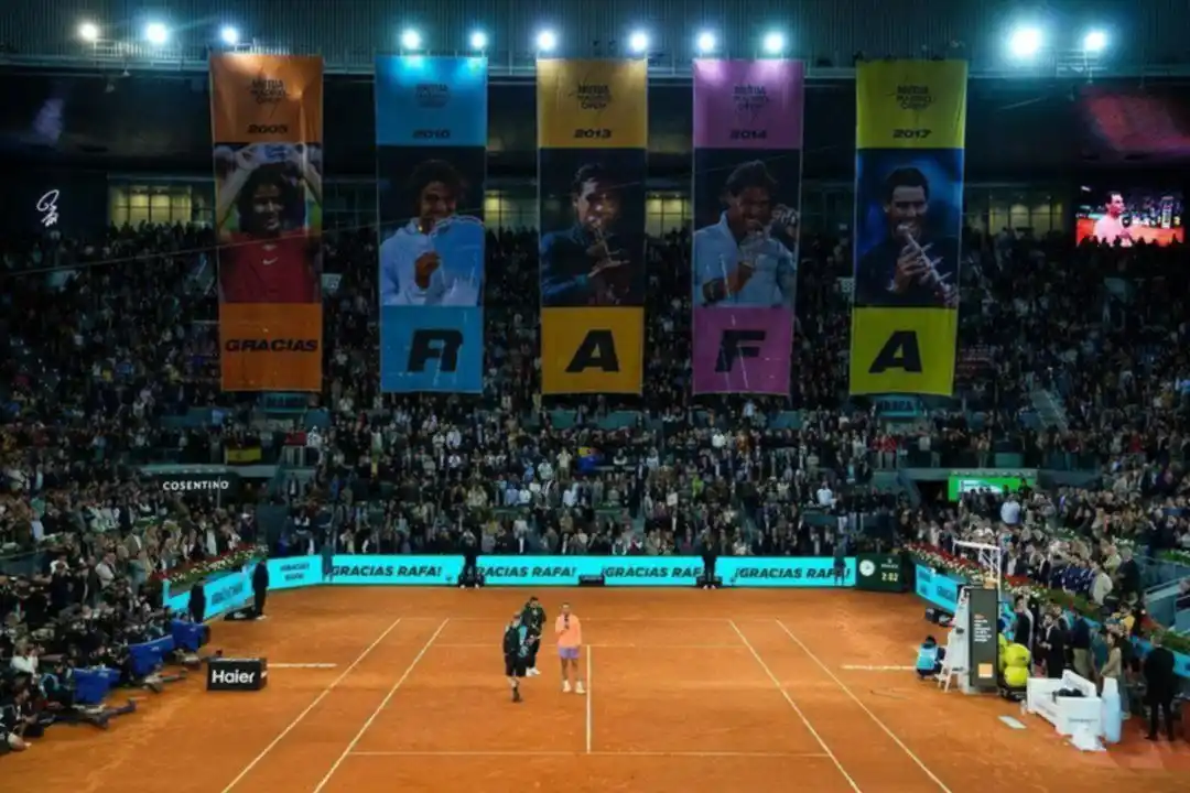 Se quitó la red en la Manolo Santana y Rafael Nadal se instaló en el medio de la cancha para ser protagonista de un momento único. al mismo tiempo que iban apareciendo desde el techo algunas banderas que formaban su nombre y recordaban su paso más importante por el Masters 1000 de Madrid.