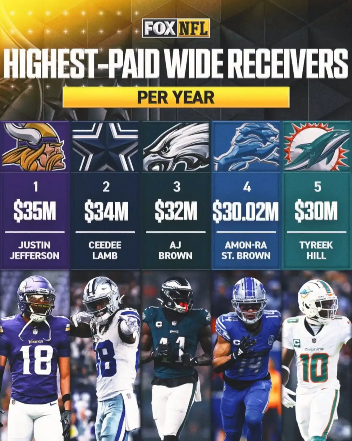 El listado de los mejores contratos (por temporada) de la NFL para wide-receivers, entonces, queda de la siguiente manera:
