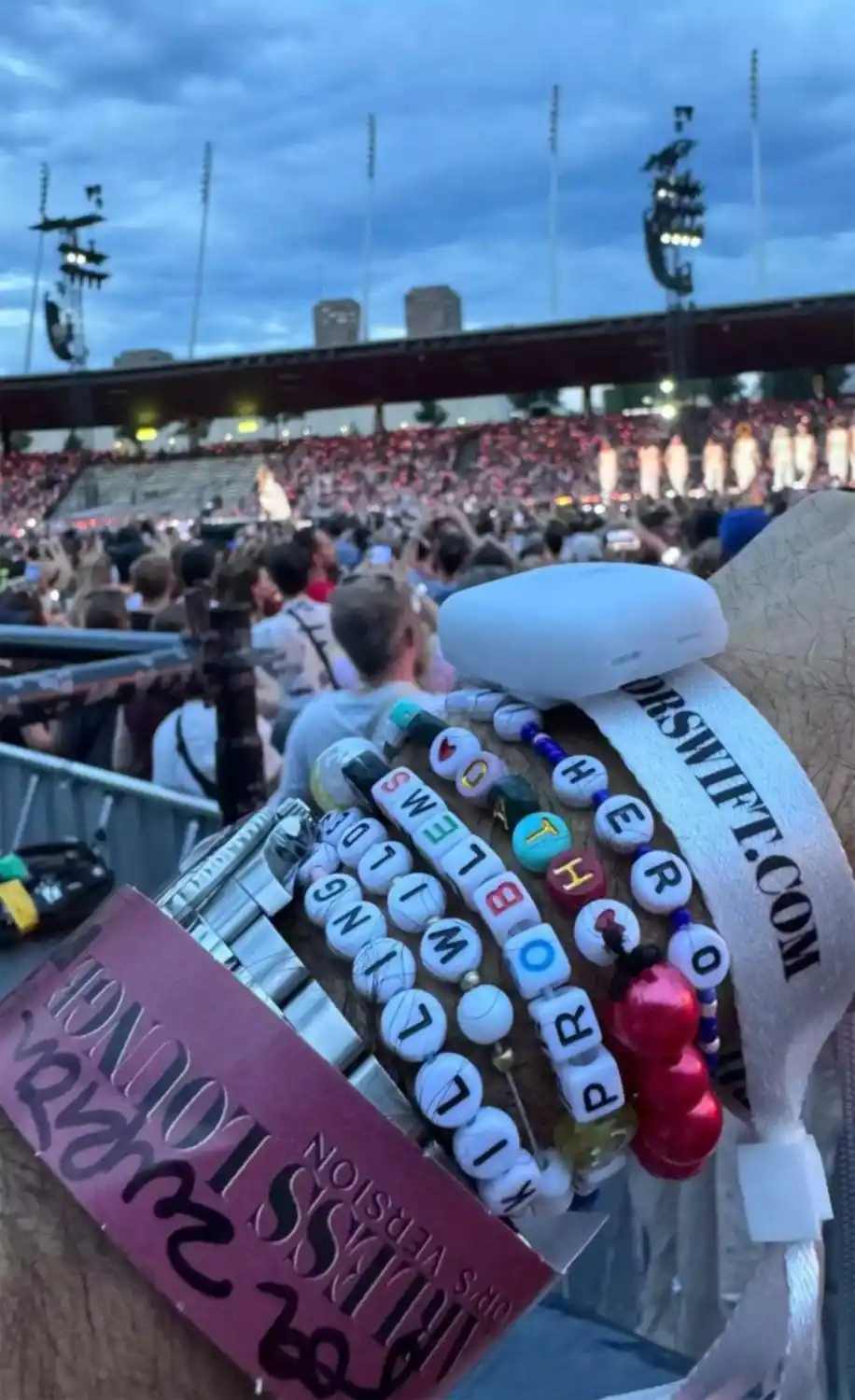 Entre su pila de pulseras parecía haber títulos de canciones de Swift, entre ellas “Anti-Hero”, “Champagne Problems” y “Wildest Dreams”. Otro usuario de X también vio a la familia de seis personas en el concierto y publicó una foto de la familia Federer entre el público.