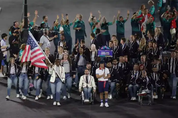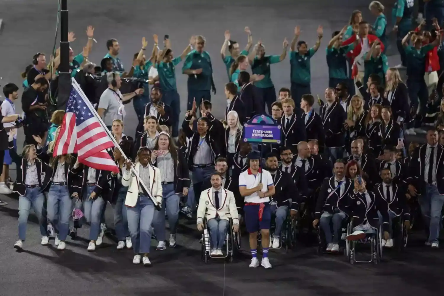 El atleta de baloncesto en silla de ruedas Steve Serio y la estrella del voleibol sentado Nicky Nieves lideraron la carga del equipo de EE. UU., llevando la bandera estadounidense a través de los Campos Elíseos hacia la Place de la Concorde, que fue donde se llevaron a cabo eventos olímpicos que incluyeron skate, baloncesto 3x3 y breaking.