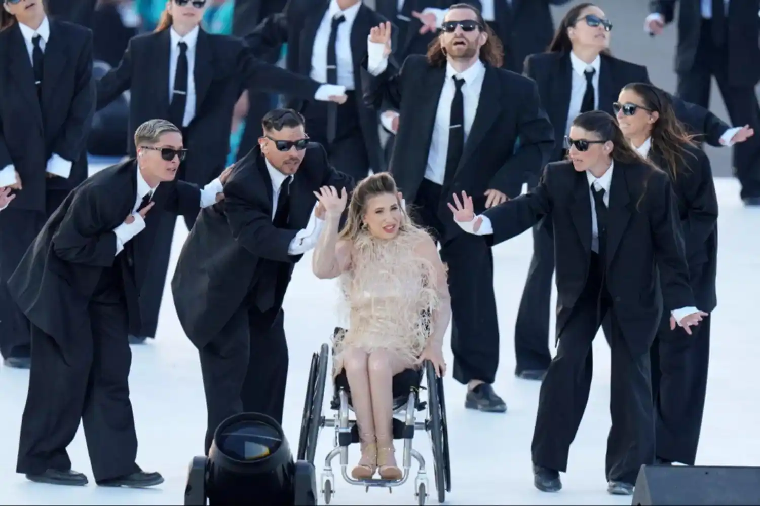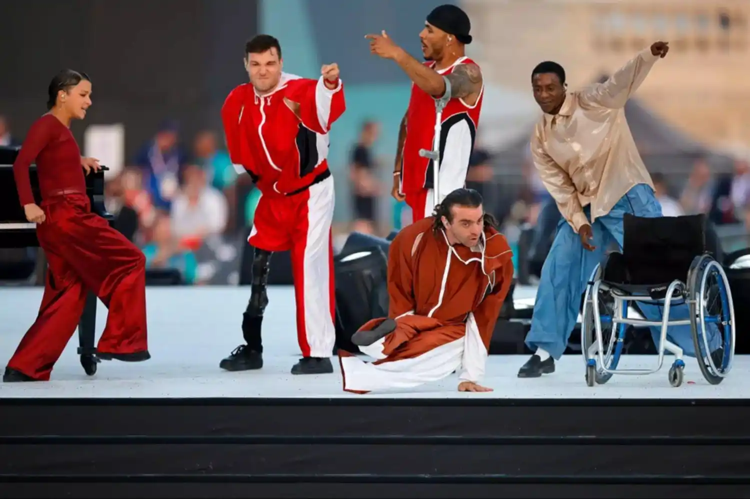 El espectáculo comenzó con la actuación de Lucky Love, un cantante francés que perdió su brazo izquierdo al nacer, junto con artistas en sillas de ruedas.