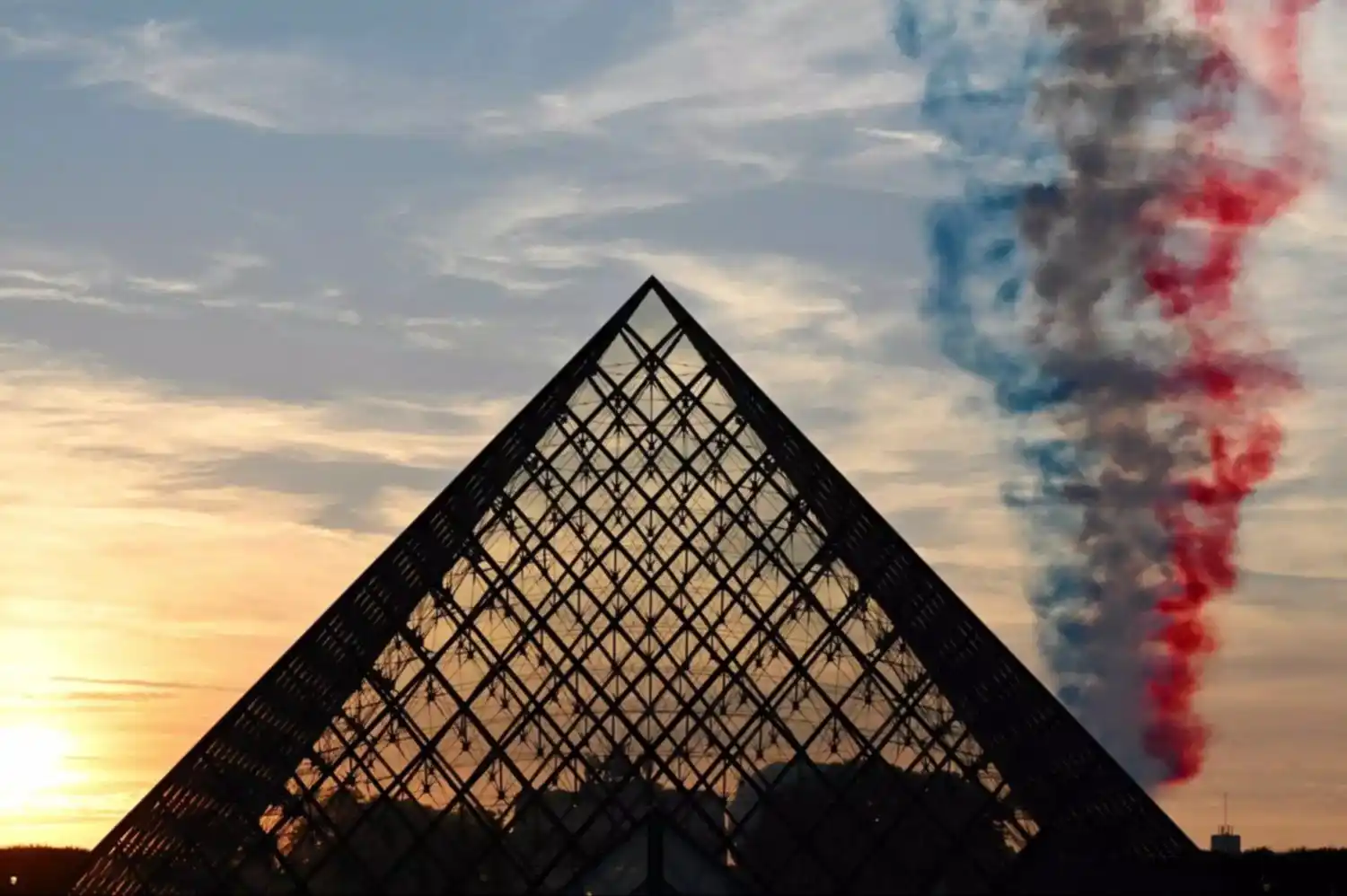 La estela de humo con los colores de la bandera nacional francesa, lanzada por el equipo de vuelo acrobático de élite de la Fuerza Aérea francesa "Patrouille de France", se ve sobre la Pirámide del Louvre durante la Ceremonia de Apertura de los Juegos Paralímpicos de París 2024.
