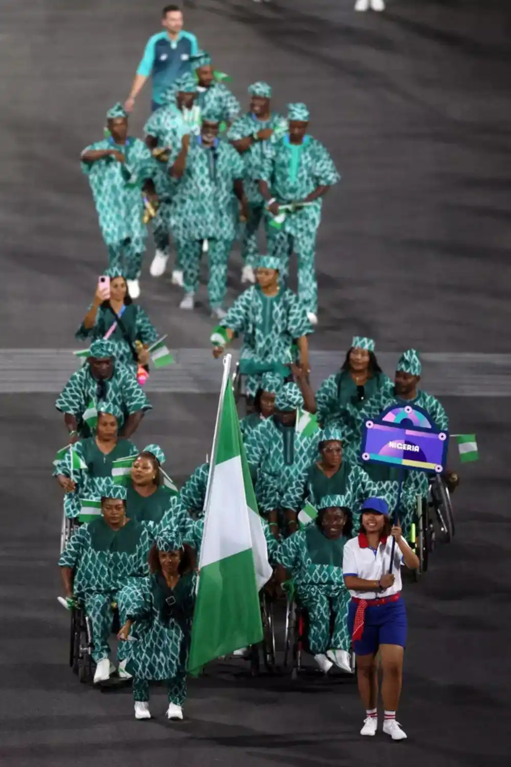 Liderando el camino del equipo de Nigeria estaba la abanderada Lauritta Onye, sosteniendo su bandera nacional mientras desfilaban por las calles de París.