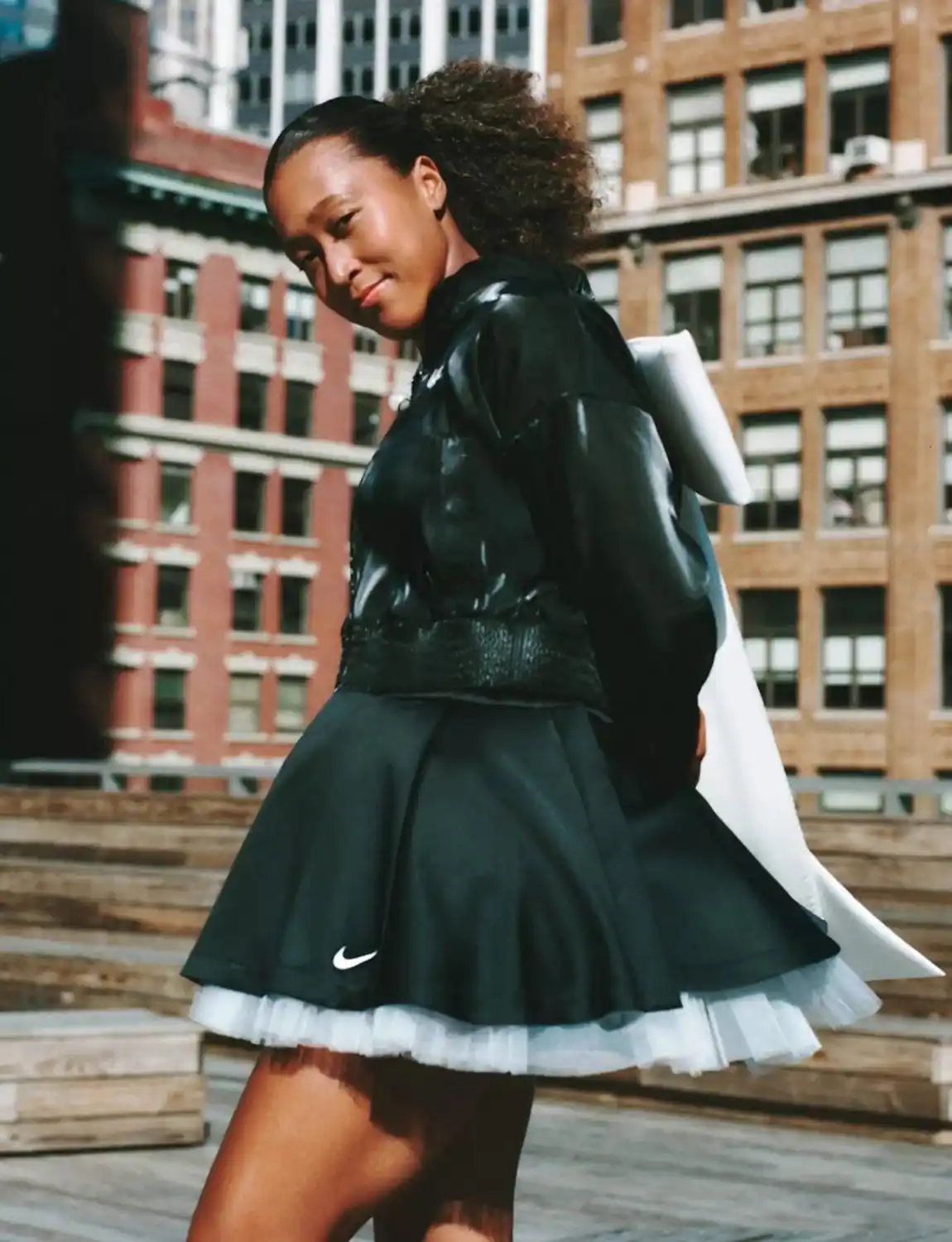 Esta semana, Naomi Osaka entrará a la cancha con una chaqueta bomber negra con un gran lazo blanco en la espalda. Debajo, usará un vestido de tenis negro con un lazo blanco más pequeño alrededor de la cintura y una falda con volados en capas. También hay pequeños lazos en la parte posterior de sus zapatos.