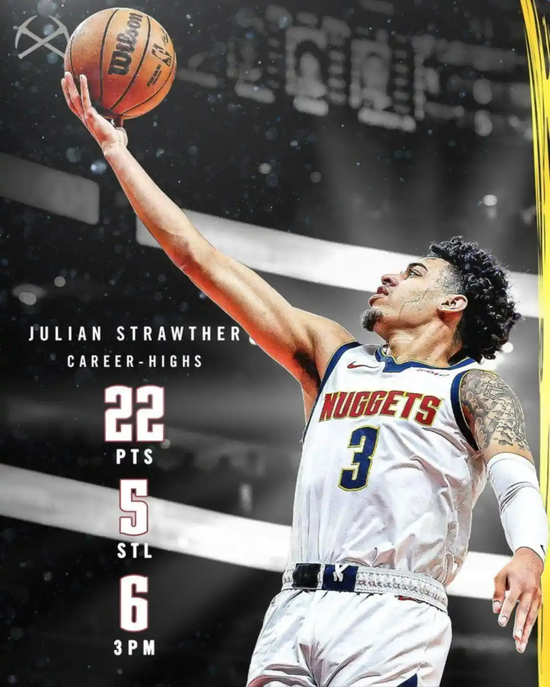 El Boricua Julian Strawther viene promediando un buen puñado de minutos a lo largo de la temporada, que le han dado confianza para el gran presente que vive. Esta vez, marcó 22 puntos viniendo desde la banca y quedó a tan solo 3 puntos del máximo anotador de su equipo en el juego, Nikola Jokic.