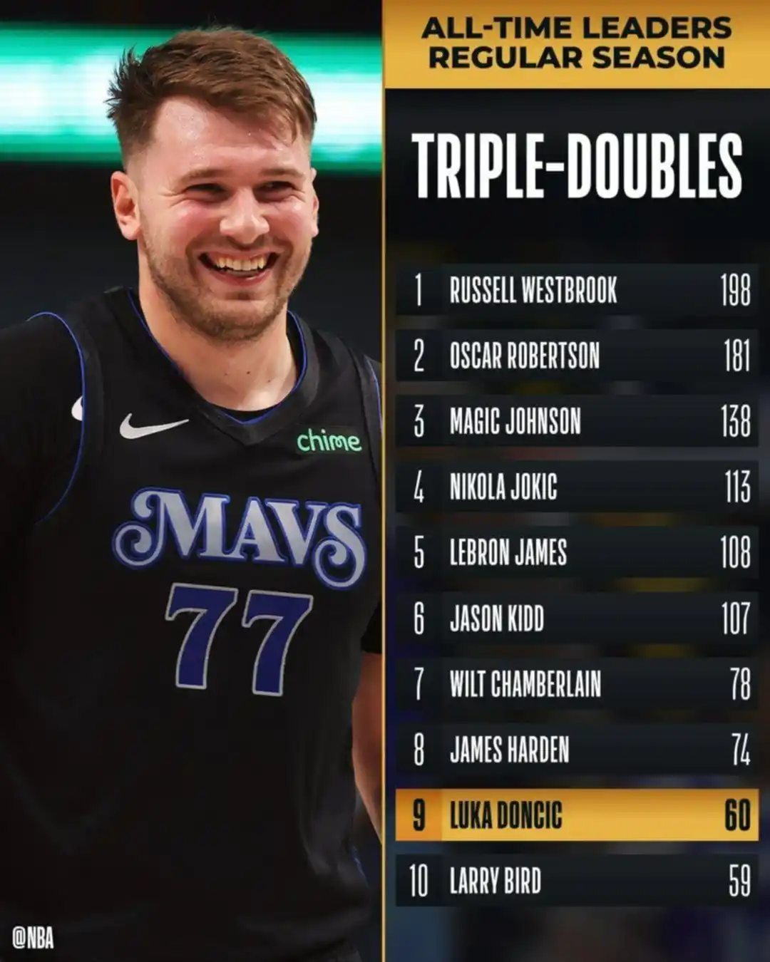 Luka Doncic es el primer jugador en la historia en registrar un triple-doble de 25 puntos o más en una primera mitad. Además, "Lukita" Doncic llegó a 60 triples-dobles en su carrera para superar a Larry Bird y quedar en solitario en la novena posición en la lista histórica de la National Basketball league.