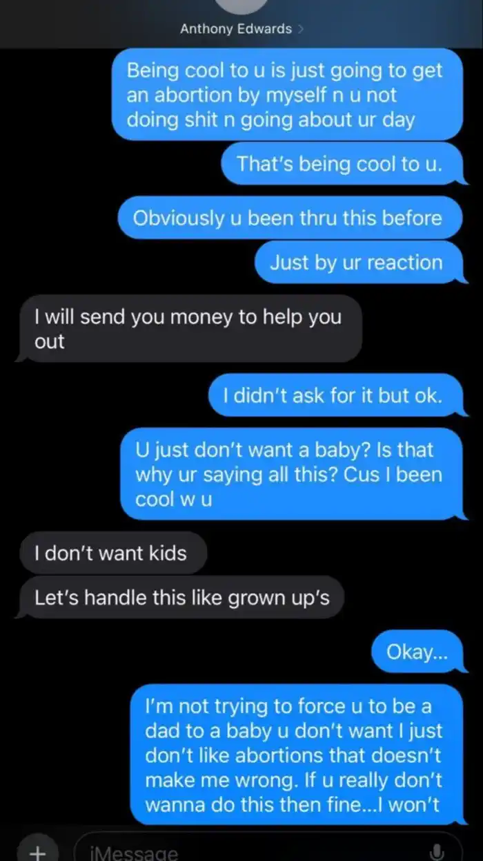 Jordae le dijo a Edwards que tuvo un aborto "hace unos 2 años" y ella lo lamenta hasta el día de hoy. "Sí, pero no soy un niño. Te enviaré dinero para ayudarte. ... No quiero tener hijos”, expresó el jugador de los Wolves