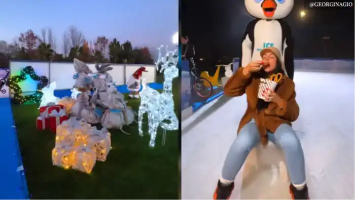 En el video se la puede ver a Georgina con un hermoso outfit invernal con el que apareció patinando de la mano de una botarga de pingüino. La prenda protagonista es un abrigo furry, en color café, sin botones y amarrado a la cintura.