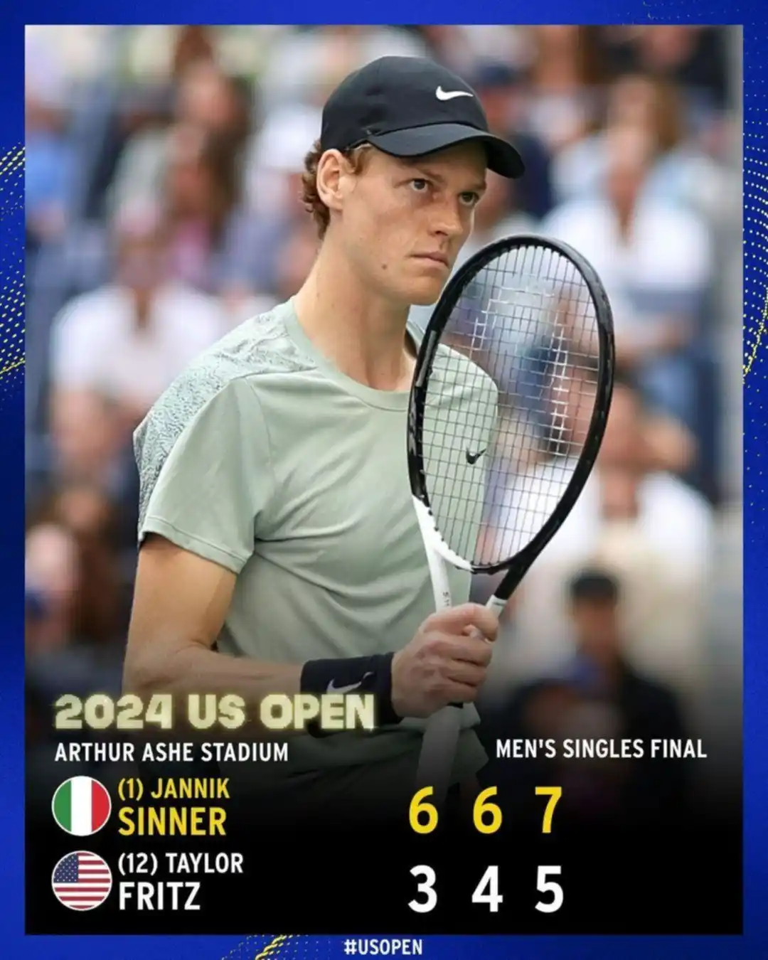 El joven tenista italiano y número 1 del Ranking ATP, Jannik Sinner, se quedó con el título en el US Open luego de vencer nada más ni nada menos que a Taylor Fritz (12º). El italiano se impuso al local por 6-3, 6-4 y 7-5, en dos horas y 16 minutos, y se consagró en el último Grand Slam del año.