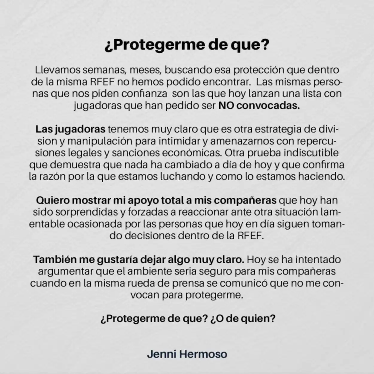 Luego de la conferencia de prensa en la cual se dio el argumento de la protección para no convocarla, Jenni Hermoso lanzó un comunicado mediante su cuenta de X (Twitter) en la cuál se preguntaba dos cosas: