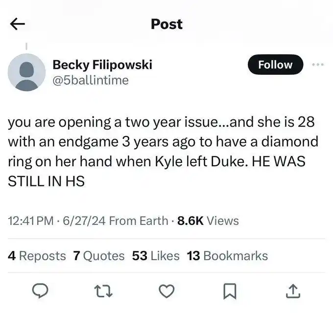 En el Draft de la NBA 2024 las miradas estaban puestas sobre Bronny James, Alexandre Sarr y Zaccharie Risacher. Pero una de las historias más interesantes no involucra a ninguno de ellos, sino a Kyle Filipowski, un pívot de 2,11 metros de la Universidad de Duke (promedió más de 16 puntos y 8,3 rebotes el año pasado) que parecía que sería elegido rápidamente en el Draft. Pero no fue así y se cree que su novia tuvo que ver.