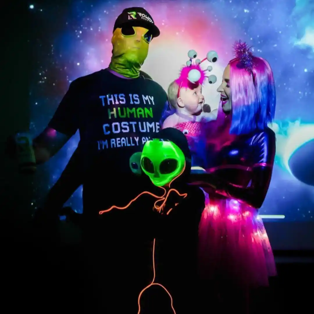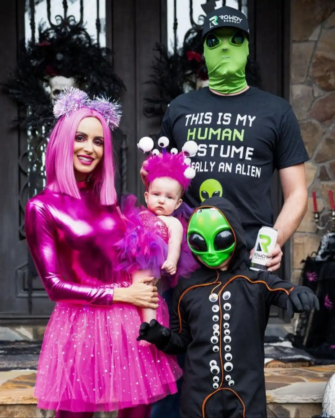 Desde su hija que en ese tiempo era una pequeña bebe, vestida de rosa con una vincha simulando múltiples ojos, en conjunto con Samantha, quien vestía un disfraz muy parecido. Mientras que Kyle estaba en juego con su hijo, ambos con máscaras verdes, las cuales eran fluorescentes y brillaban en la oscuridad.