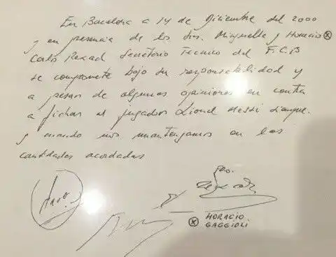 "En Barcelona, a 14 de diciembre del 2000 y en presencia de los Srs. Minguella y Horacio, Carles Rexach, secretario técnico del FC Barcelona, se compromete bajo su responsabilidad y a pesar de algunas opiniones en contra a fichar al jugador Lionel Messi siempre y cuando nos mantengamos en las cantidades acordadas", dice la servilleta del primer contrato del capitán argentino.