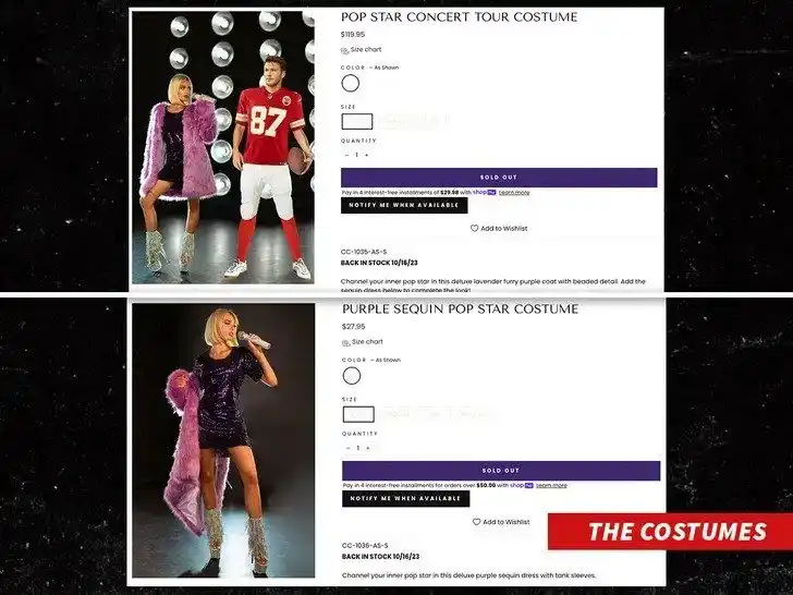 Se vendían por $27,95 dólares y $119,95 dólares respectivamente, pero ahora, 3 Wishes dice que su inventario ha sido saqueado por fanáticos que querían parecerse a la nueva pareja del mundo del espectáculo. La tienda afirma que tenían 500 trajes de Taylor Swift en solitario y 300 trajes de la pareja.