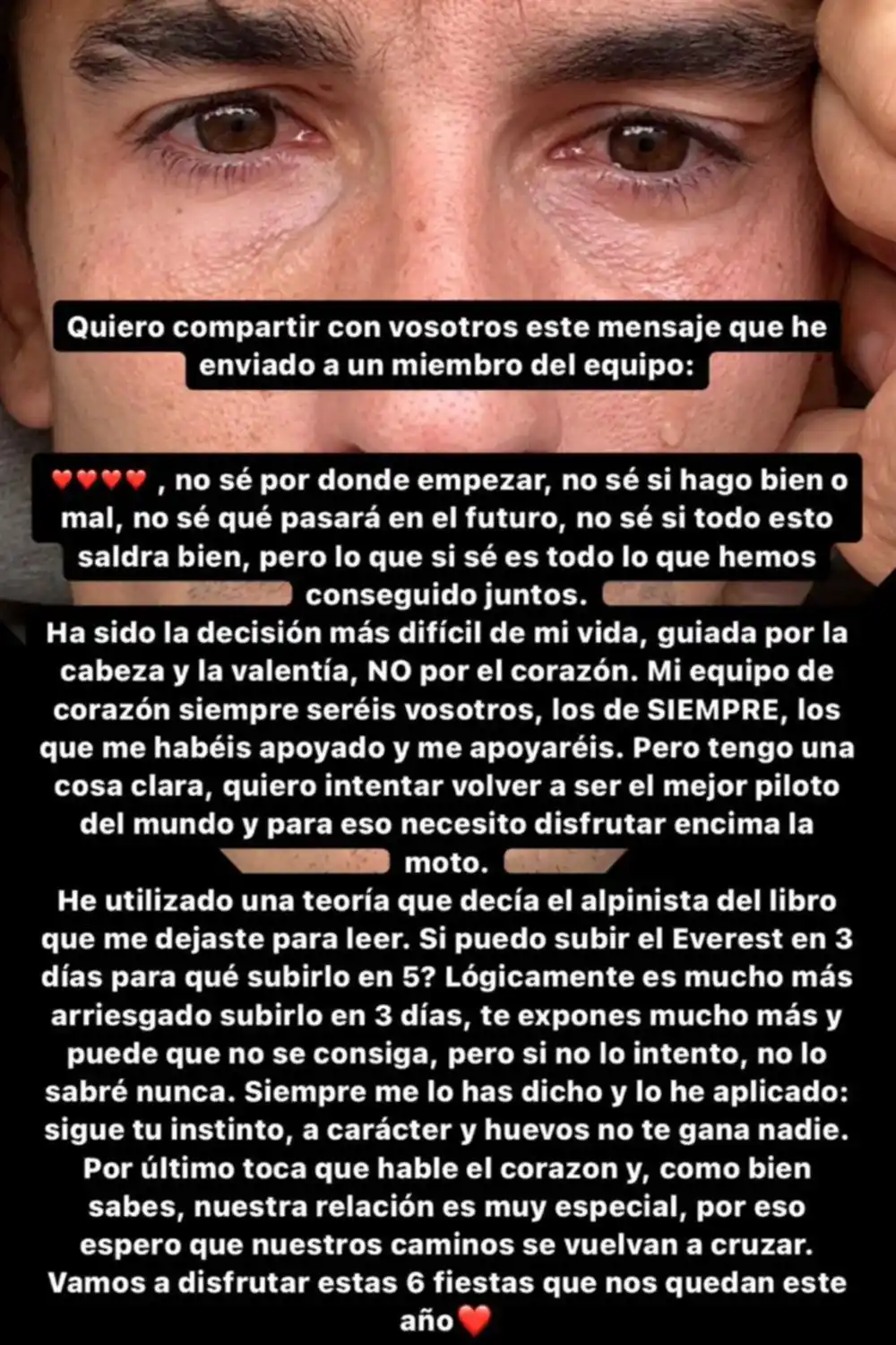 "Ha sido la decisión más difícil de mi vida, guiada por la cabeza y la valentía, NO por el corazón. Mi equipo de corazón siempre seréis vosotros, los de SIEMPRE, los que habéis apoyado y me apoyaréis. Pero tengo una cosa clara, quiero intentar volver a ser el mejor piloto del mundo y para eso necesito disfrutar encima de la moto".