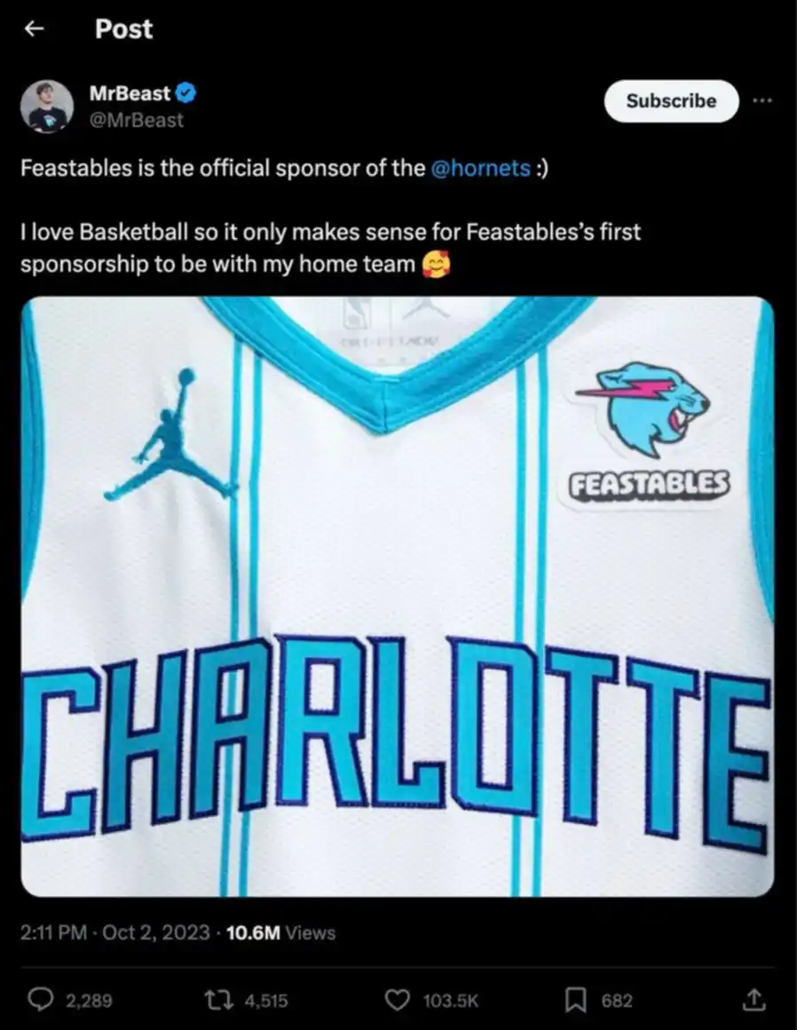 “Amo el básquet, por lo que solo tiene sentido para Feastables que su primer patrocinio sea el equipo de mi ciudad natal”, posteó el influencer en X.