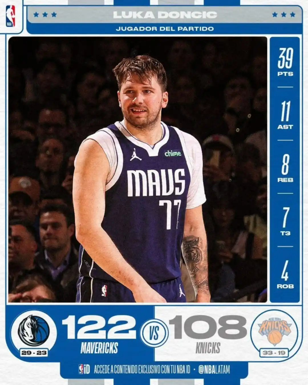 El joven jugador de 24 años Luka Doncic firmó 39 puntos, 11 asistencias y 8 rebotes en 40 minutos dentro del campo de juego. Los Dallas Mavericks lograron una importante victoria por 122 a 108 ante los New York Knicks en condición de visitante que los posiciona en la octava posición de la Conferencia Oeste de la NBA .