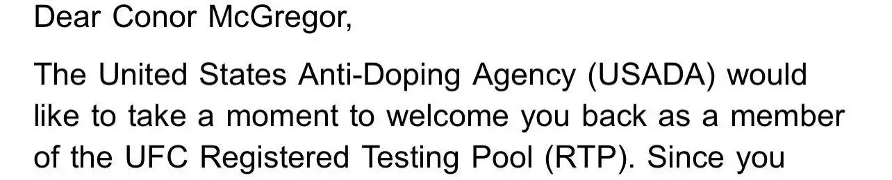 “Querido Conor McGregor. A la Agencia Antidopaje de los Estados Unidos le gustaría tomarse un momento para darle la bienvenida de regreso como miembro de la UFC Registered Testing Pool”, mostró.