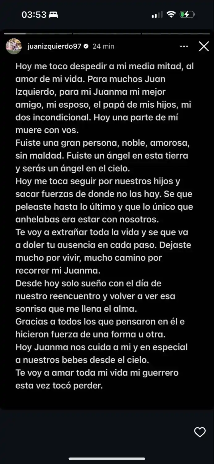 Juan Izquierdo estaba casado con Selena y tenía dos hijos: una nena de dos años y un varón de diez días de vida. La vida quiso que los pequeños crecieran solo con vagos recuerdos de su papá, un hombre humilde, bondadoso, trabajador, agradecido. Es que así lo describió su esposa en la conmovedora carta de despedida que subió a sus redes sociales: “Fuiste una gran persona, noble, amorosa y sin maldad. Fuiste un ángel en esta tierra y serás un ángel en el cielo”. Y así se mostró él mismo, tiempo atrás, cuando dejó una frase que hoy se resignifica y que no podría generar más nostalgia: “Aprendí mucho a valorar cuando tengo salud, que parece normal”.