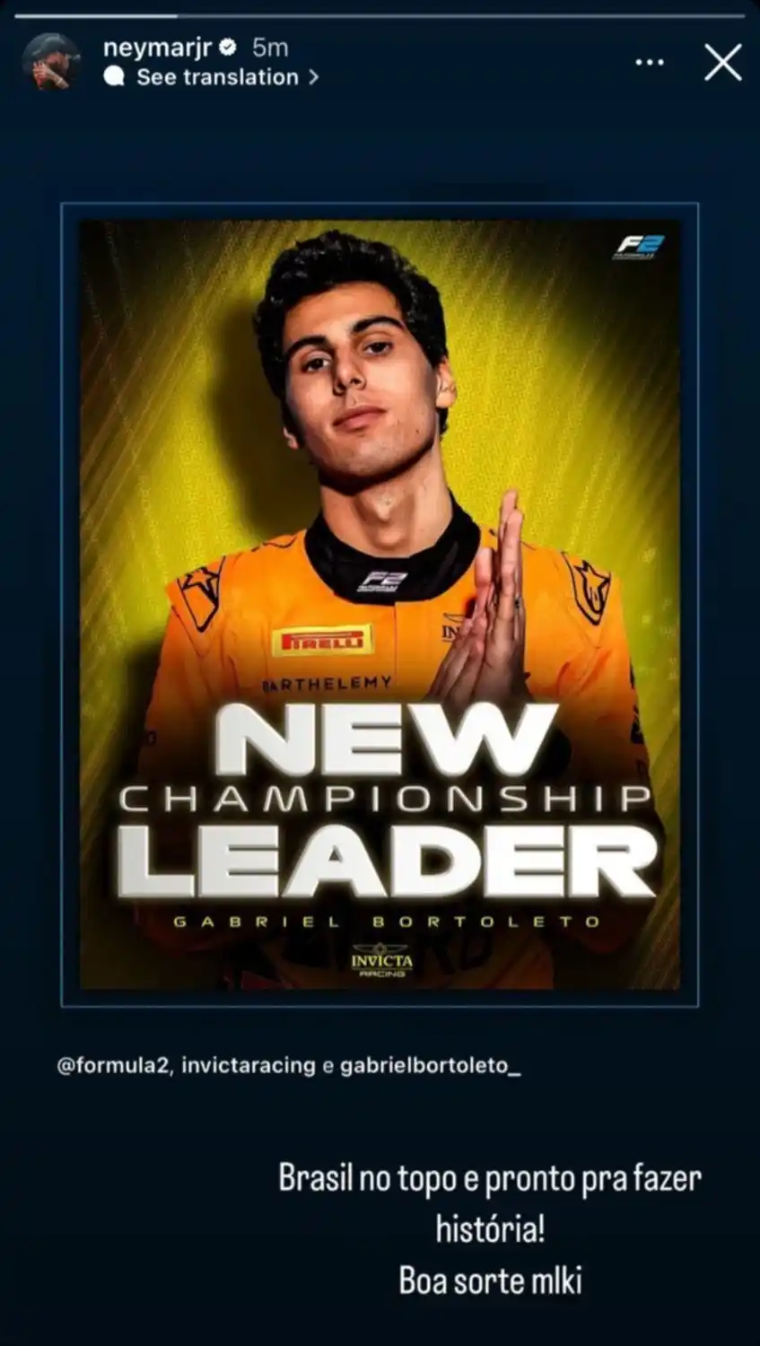 Kick Sauber acaba de confirmar a Bortoleto como su piloto para el año que viene, una gran noticia para todo Brasil, que siempre ha apoyado a su joven estrella del automovilismo. Es el caso de Neymar Jr., el futbolista del Al-Hilal de Arabia Saudita que cuando había un contexto de incertidumbre y ansiedad respecto de quién ocuparía el lugar en Sauber, subió a sus redes sociales una foto de Bortoleto con un mensaje de apoyo hacia él, luego de que tomara el primer puesto del Campeonato de Pilotos de la Fórmula 2: “Brasil en la cima y listo para hacer historia. Buena suerte”.