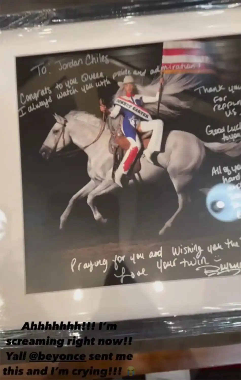 A principios de este mes, Chiles compartió una copia enmarcada del arte del álbum Cowboy Carter de Beyoncé en sus Historias de Instagram con una nota personal de la cantante escrita con marcador plateado.
