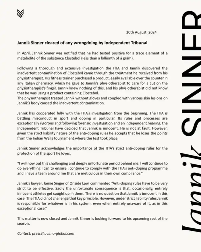 El actual número 1 del mundo del ranking ATP, Jannik Sinner, dio positivo en dos controles antidopaje pero no será sancionado ya que lo declararon inocente. Cabe destacar La Agencia Internacional para la Integridad del Tenis no se opuso a los recursos presentados por Sinner para levantar las suspensiones provisionales.