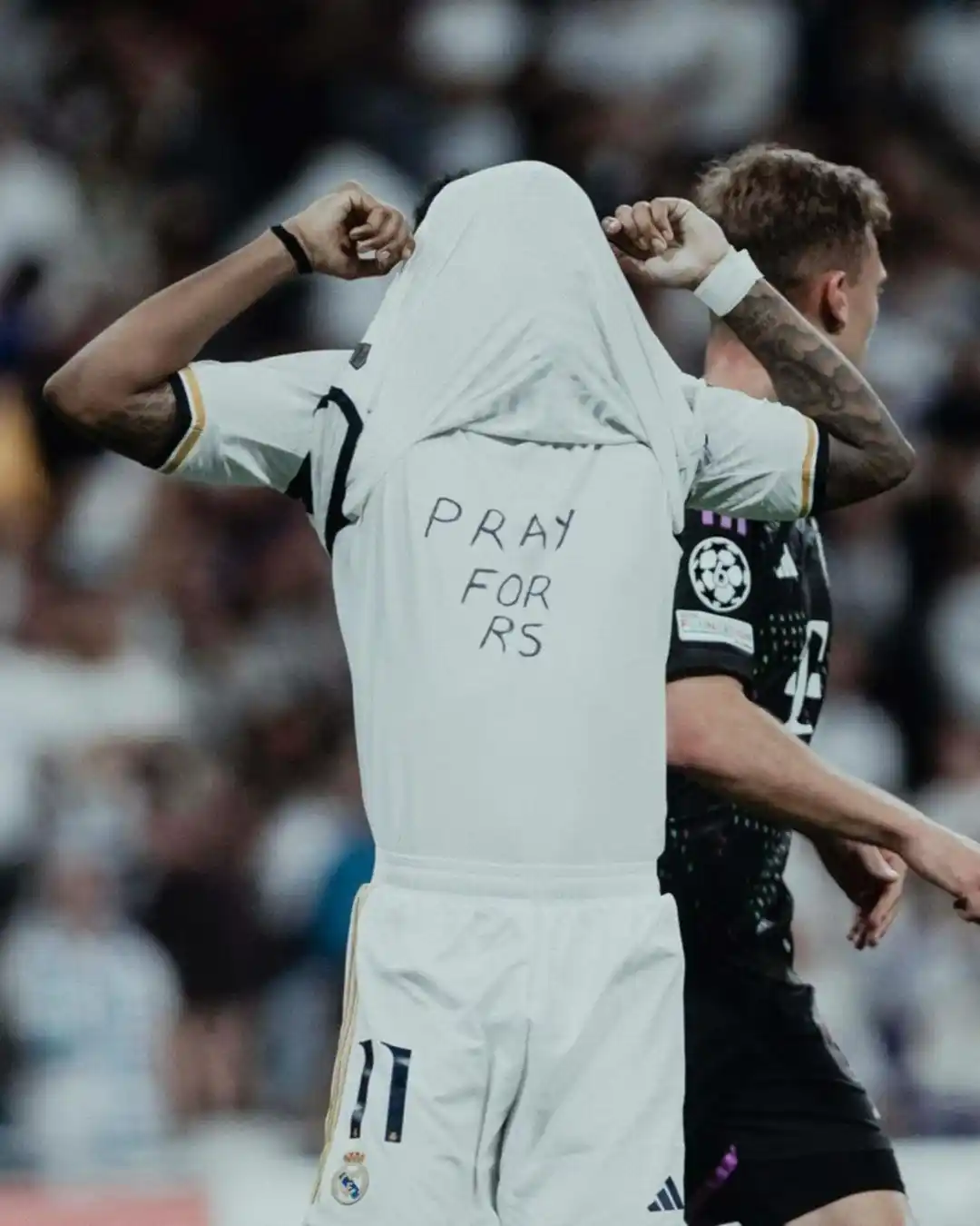 Durante el partido de vuelta de las semifinales de la Champions League entre Bayern Munich y Real Madrid, Rodrygo tuvo presente a su país. Tras el pitido final y la clasificación a la final, el talentoso delantero se levantó la camiseta y debajo mostró una remera con la frase “Pray for R5”. El mensaje es claro. Rodrygo ha pedido públicamente que por favor recen por Rio Grande Do Sul, el lugar donde han estado ocurriendo las inundaciones. Un gesto sumamente valioso y con mucha exposición.