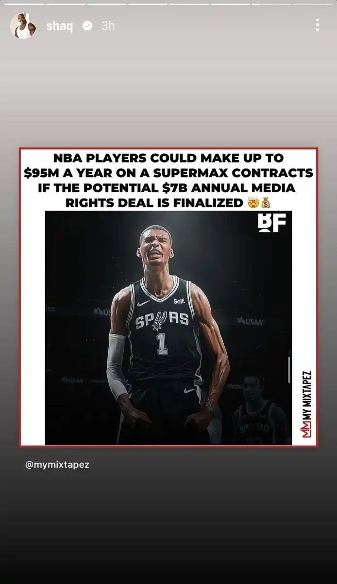 Shaquille O'Neal coincidió en que un jugador de élite puede ganar hasta 95 millones de dólares al año con el creciente valor de los derechos mediáticos. Shaq recurrió a sus historias de Instagram y compartió un gráfico con esta información.