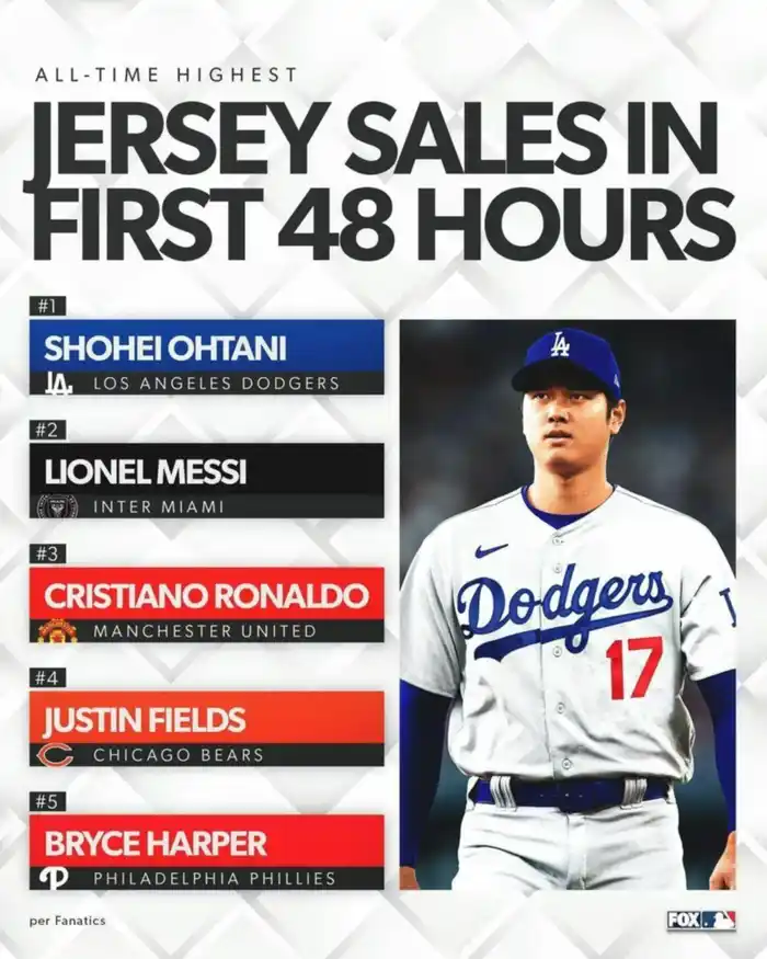 La información fue medida y publicada por la empresa que fabrica las camisetas oficiales de la Major League Baseball y otros deportes, “Fanatics”. No solo dijeron que Shohei Ohtani había roto todo tipo de récords sino que también lanzaron un comunicado con las 5 camisetas más vendidas de la historia en las primeras 48 horas de haber firmado.