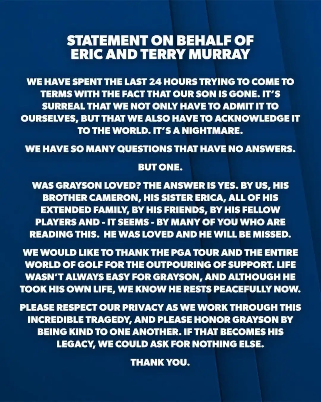 Los padres de Grayson Murray escribieron: “Hemos pasado las últimas 24 horas tratando de aceptar el hecho de que nuestro hijo se ha ido. Es surrealista que no solo tengamos que admitirlo ante nosotros mismos, sino que también tengamos que reconocerlo ante el mundo. Es una pesadilla... La vida no siempre fue fácil para Grayson, y aunque se quitó la vida, sabemos que ahora descansa en paz”. Y también: