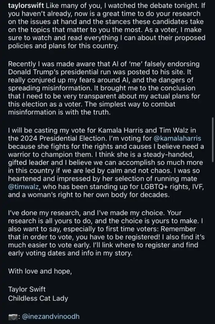 Luego del debate entre Harris y Trump, Swift usó su cuenta de Instagram para expresar su apoyo a la candidata demócrata. La artista, en 2020, ya se había expresado en favor de Biden y se muestra muy involucrada en la política: “Votaré por Kamala Harris y Tim Walz en las elecciones presidenciales de 2024. Votaré por @kamalaharris porque lucha por los derechos y las causas que creo que necesitan un guerrero que los defienda. Creo que es una líder talentosa y de mano firme, y creo que podemos lograr mucho más en este país si nos guía la calma y no el caos. Me sentí muy alentada e impresionada por su elección de compañero de fórmula @timwalz, que ha estado defendiendo los derechos LGBTQ+, la fertilidad asistida y el derecho de la mujer sobre su propio cuerpo durante décadas”, escribió la estrella pop a sus 283 millones de seguidores en Instagram.