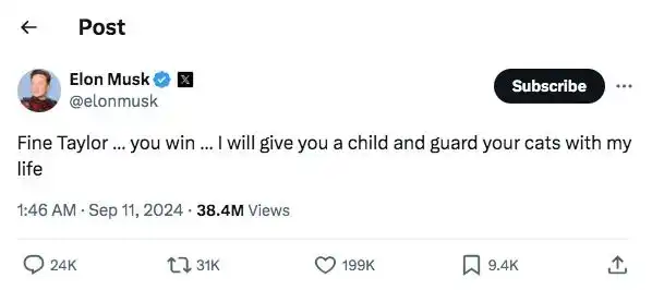 No pasó mucho hasta que Elon Musk, empresario multimillonario y dueño, entre otras cosas, de X, le “contestó” a la cantante. Escribió en la red social que posee y en respuesta al “seudónimo” que Swift había usado: “Bien, Taylor... tú ganas... te daré un hijo y cuidaré a tus gatos con mi vida”. Un comentario a modo de broma que erizó los pelos de algunos y, todavía, no recibió respuesta de parte de la cantante más popular del momento.