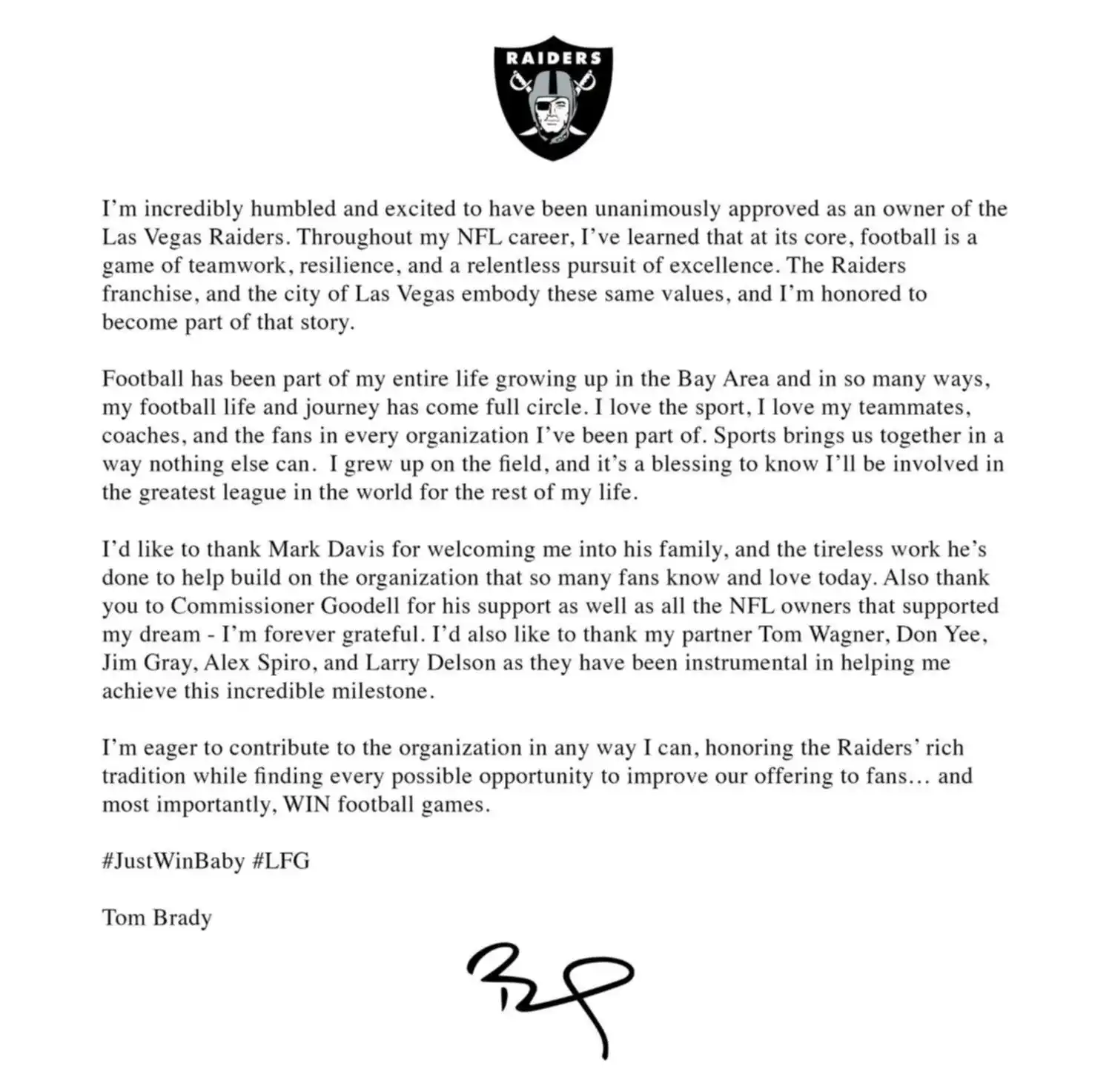 El acuerdo llegó inicialmente en mayo de 2023, pero los propietarios tardaron 17 meses en dar su aprobación debido a las preocupaciones de que Brady estaba recibiendo un descuento demasiado grande del propietario mayoritario de los Raiders, Mark Davis. El nuevo trabajo de Brady como locutor de Fox también fue un problema porque podría representar un conflicto de intereses. Sin embargo, finalmente se confirmó y Brady lo anunció en sus redes sociales. Subió un comunicado suyo y escribió: “Comprometido con la excelencia”.