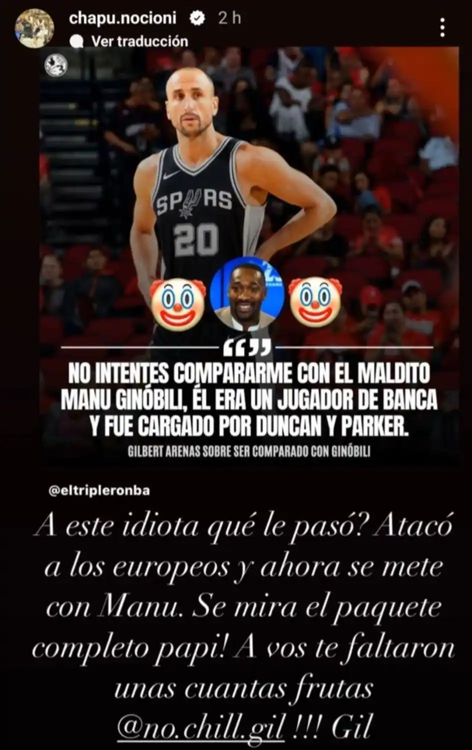Desde entonces, Nocioni y Arenas protagonizaron un cruce interminable vía Instagram. El estadounidense lo burló y el argentino continuó defendiendo a su amigo Ginóbili. “No estoy seguro de lo que dice, pero estoy seguro de que están de acuerdo conmigo. Chapu Nocioni, ¿todavía estás enojado por ese tiro ganador en los playoffs?”, posteó. El argentino volvió a llamarlo payaso y Arenas concluyó atacándolo nuevamente: